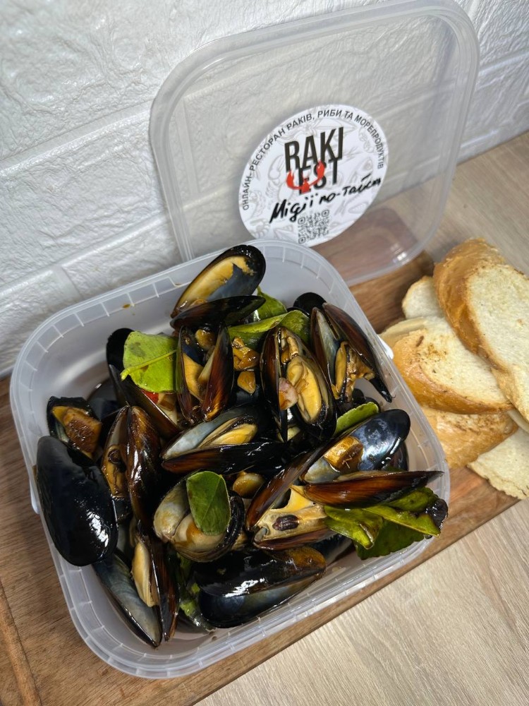 Мідії по-тайськи в мушлі 900 грам (подаються з гріночками)