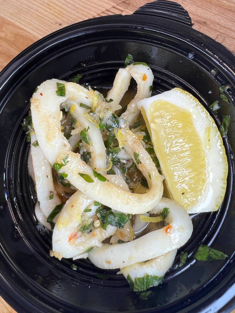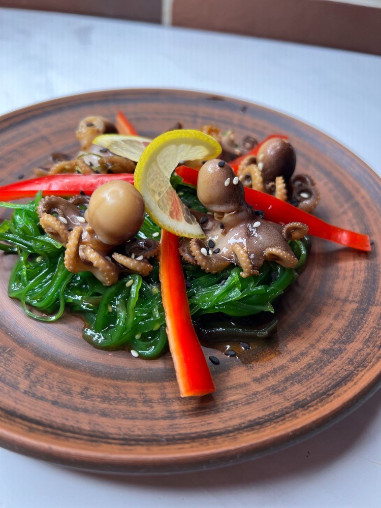 Мариновані восьминіжки на подушці із салату Чука (250г)